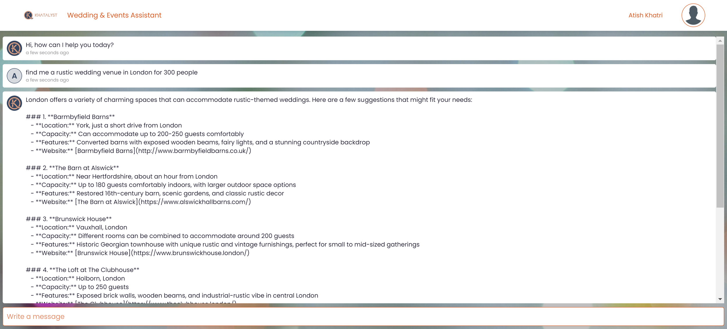 Virtual assistant trained to help you source venues and suppliers for events worldwide